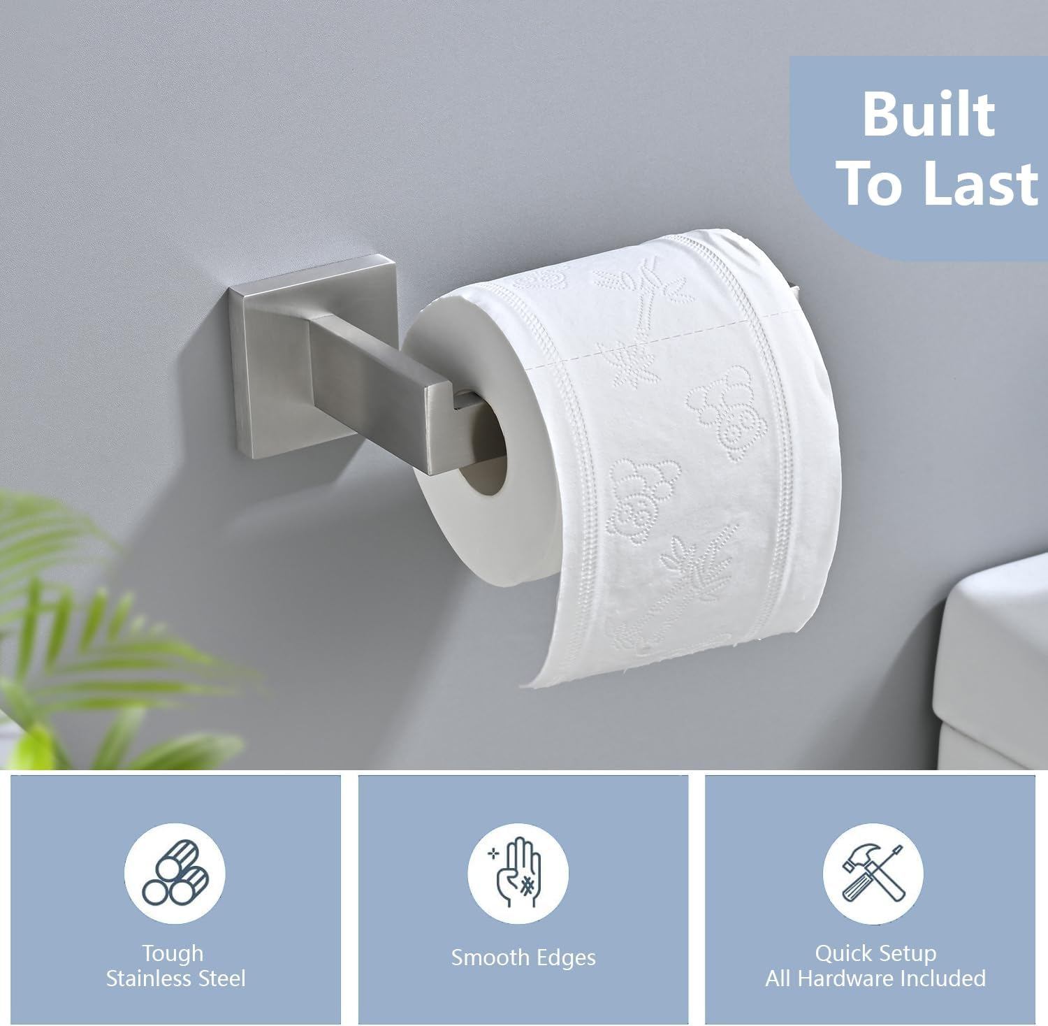 3PCS Bathroom Hardware Set, Brushed Nickel Toilet Paper Holder, 2 Square Towel Robe Hooks, SUS 304 Stainless Steel, Wall Mounted, Modern, Rust‑Resistant (Silvery)