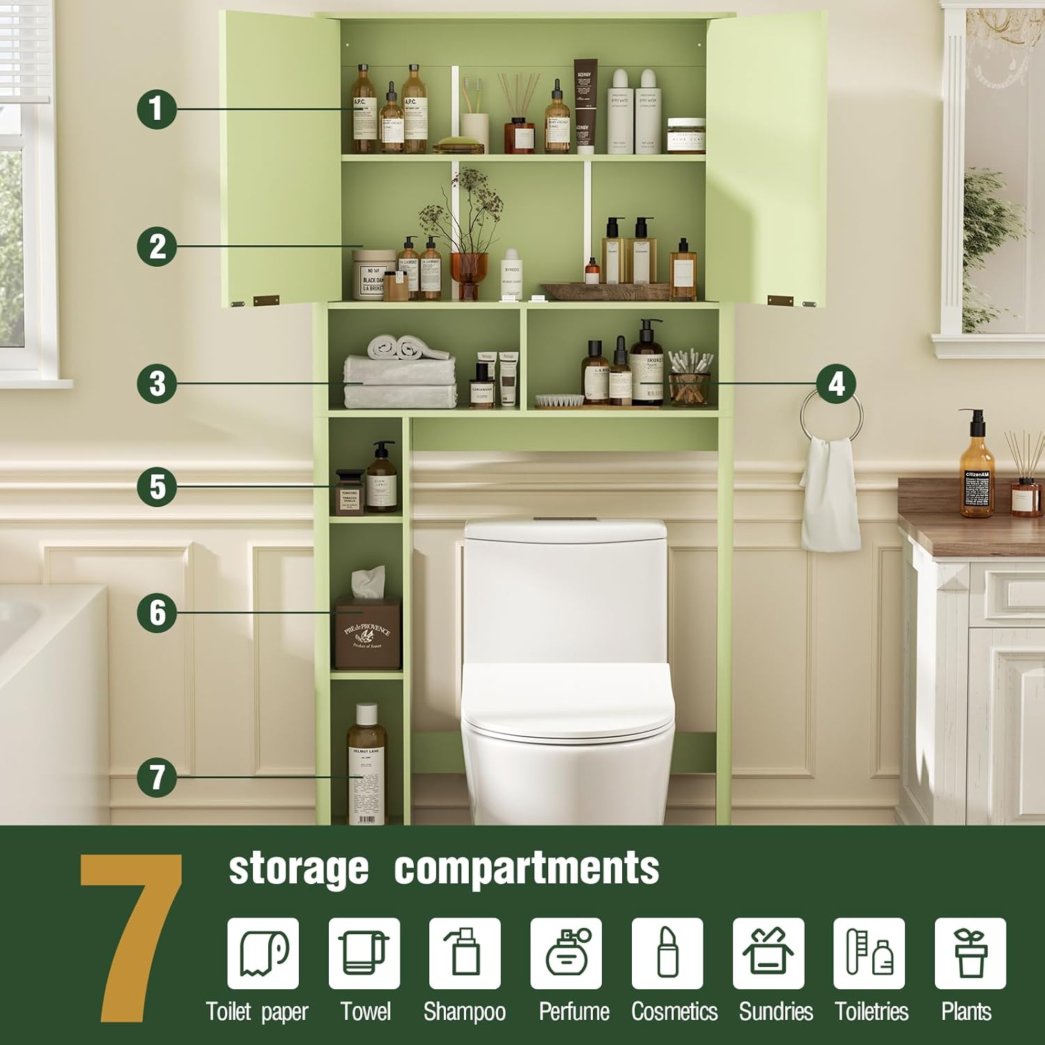 - Multi-functional unique design: Our over the toilet storage cabinet has a 3-position adjustable removable shelf on the upper part of the cabinet that can be adjusted according to your own storage needs, satisfying your desire for flexible storage. There are also 5 open compartments for quick access to everyday items