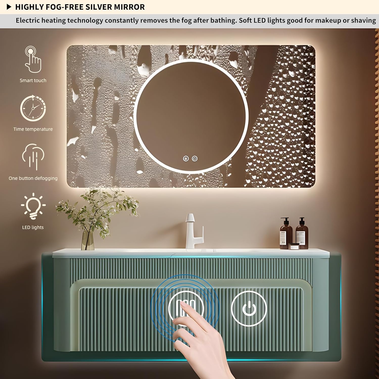 - SMART MIRROR CABINET WITH DEFOGGER: Enhance your bathroom vanity with smart mirror, equipped with defogging technology. A single touch of the demist button ensures a crystal-clear reflection, even after a shower. The built-in LED lighting provides perfect illumination for makeup application, shaving, and grooming, making it a must-have feature in your bathroom vanity setup.