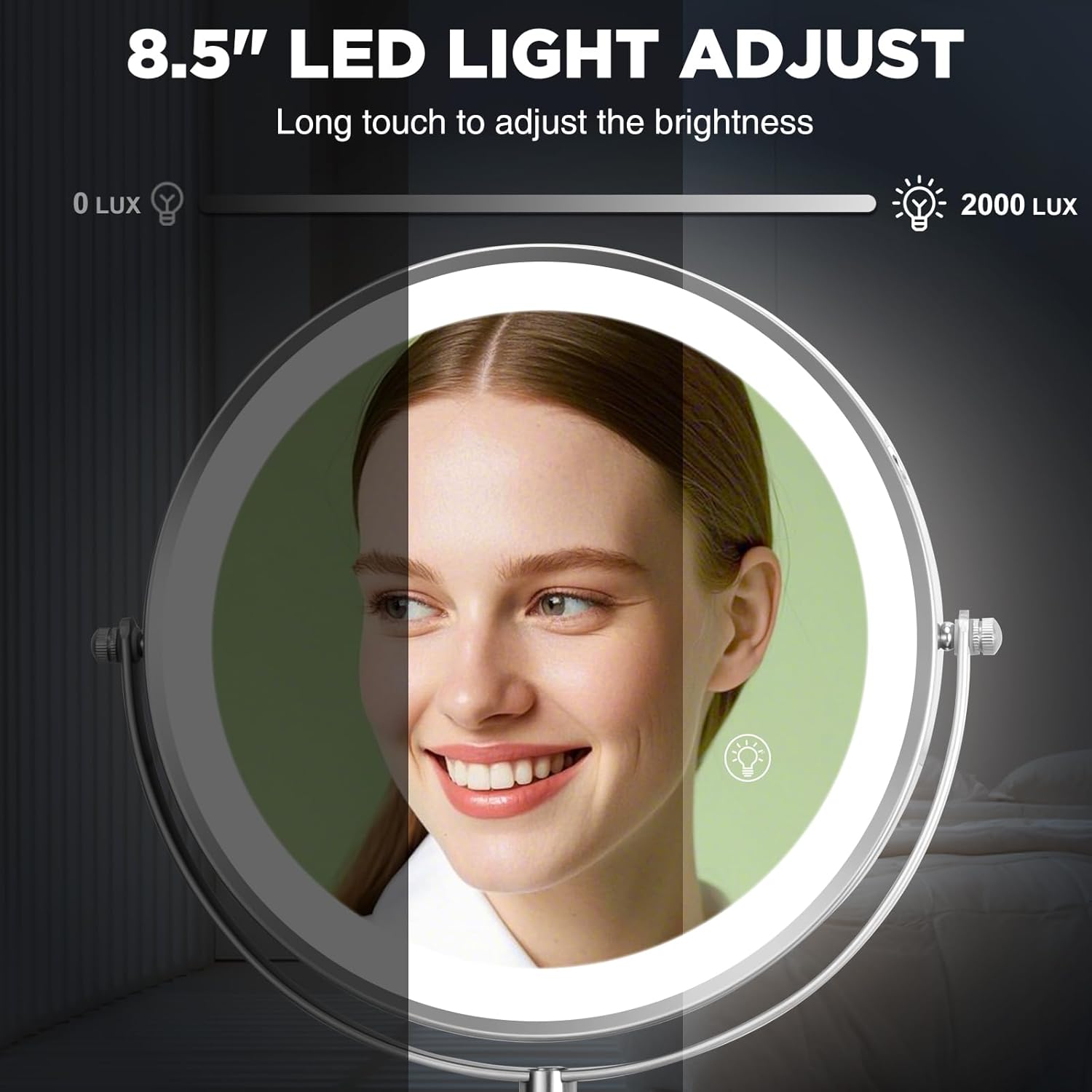 - Double Side 30X/1X Magnification Mirror::This 8.5-inch vanity makeup mirror features a double-sided design with 30X lighted bathroom mirror for extreme close-ups and 1X true-to-life reflection for full-face viewing. The 30X side is perfect for intricate tasks like eyeliner application, tweezing, or mascara, while the 1X side provides a crystal-clear, distortion-free image. Tip: Maintain a 2-inch distance when using the 30X side to avoid dizziness.