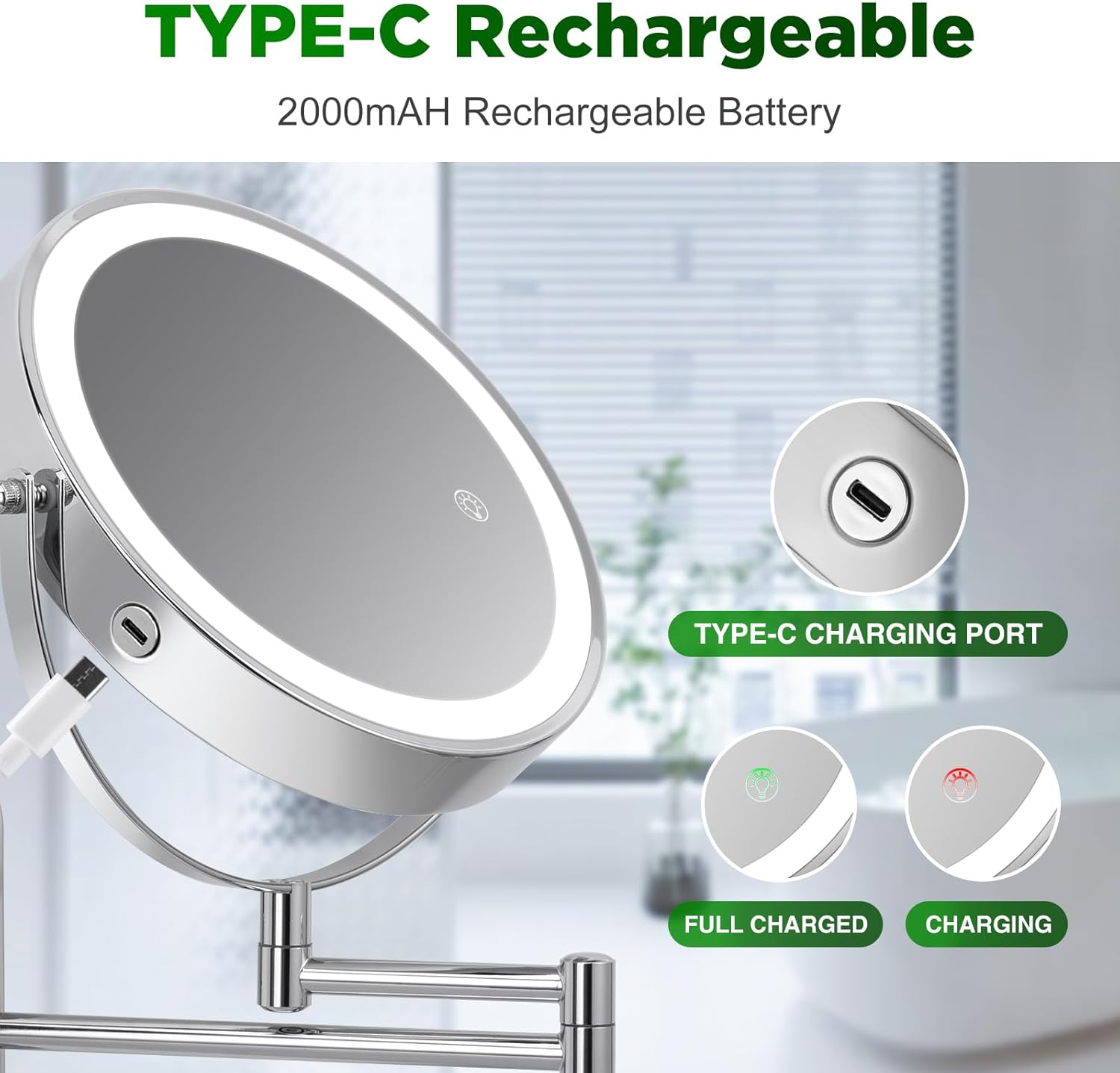 - Long-Lasting Power with Cordless Smart Energy Saving:Say goodbye to tangled cords and frequent battery changes! This mirror is equipped with a 2000mAh rechargeable battery (Type-C charging included). The auto shut-off feature turns off the lights after 30 minutes of inactivity, conserving energy effortlessly.