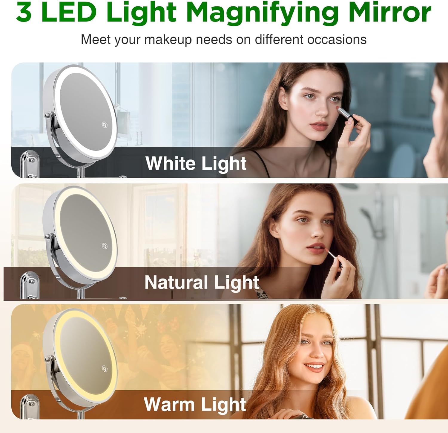 30X Wall Mounted Makeup Mirror, 3 Color Modes & Adjustable Light, Bathroom Vanity Makeup Mirror with 360 Rotation Extendable Swivel Arm,Double Side Magnifying Mirror - Chrome