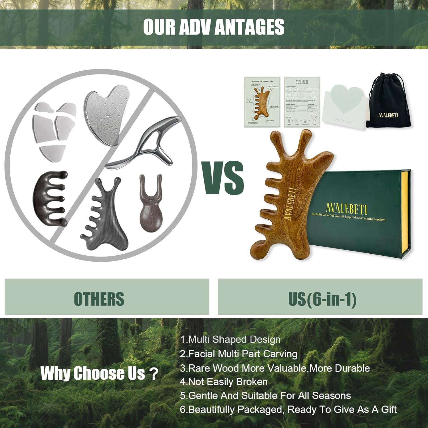 6-in-1 Gua Sha Tool for Face & Body, Natural Sandalwood – Lymphatic Drainage, Jaw Lifting & Nose Sculpting, Head Scalp Massage Comb for Stress Relief, Home Office Self Care Gifts for Women