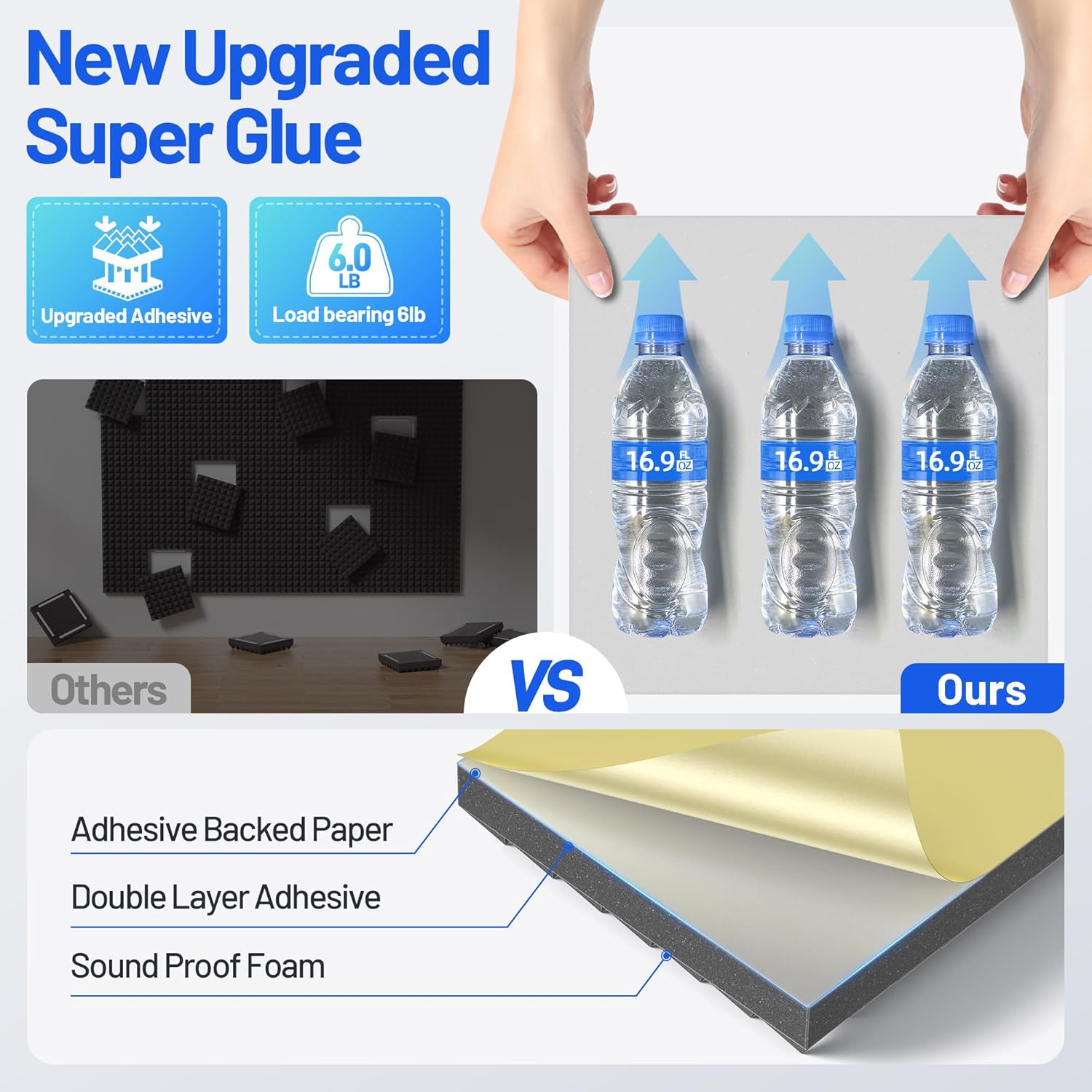 - 💪Super Strong Adhesive: Say goodbye to the trouble of the panel falling off! The adhesive layer of the sound proof foam panels for walls uses a newly upgraded strong double sided adhesive, which greatly improves the adhesion.No tools or additional adhesives are required, just peel off the kraft paper backing and you can easily stick sound dampening panels to the wall, door, window or ceiling.
