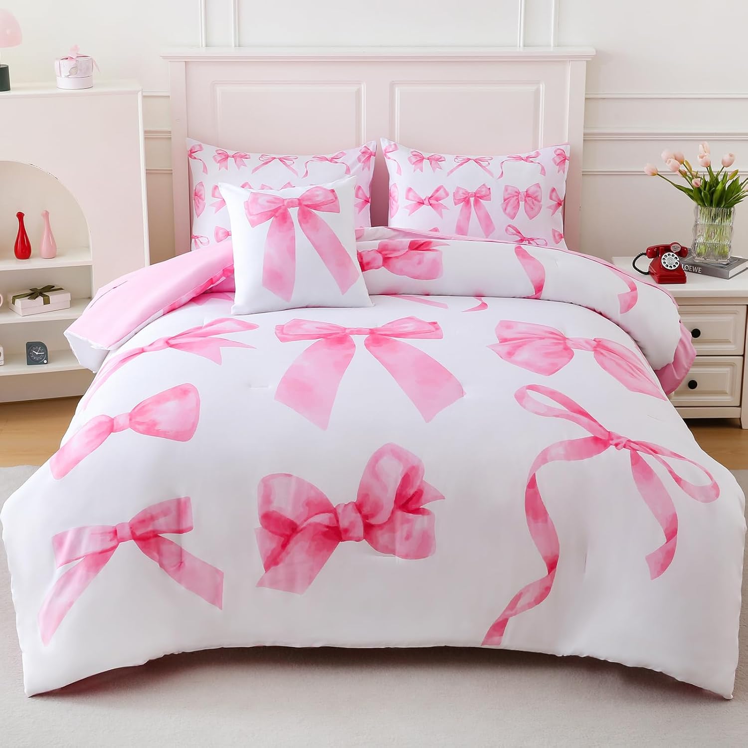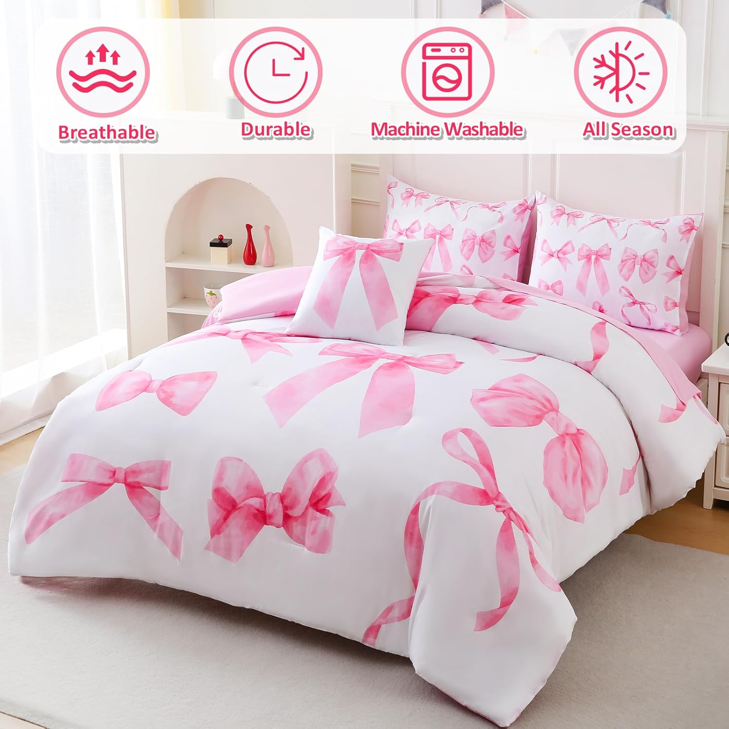 - [Inspire Imagination Bedding Decor] This pink bow themed full size sheets and comforter set can be used for all season.Suitable for school or home also can be a choice for kids on Thanksgiving,Christmas,birthdays,back-to-school season.