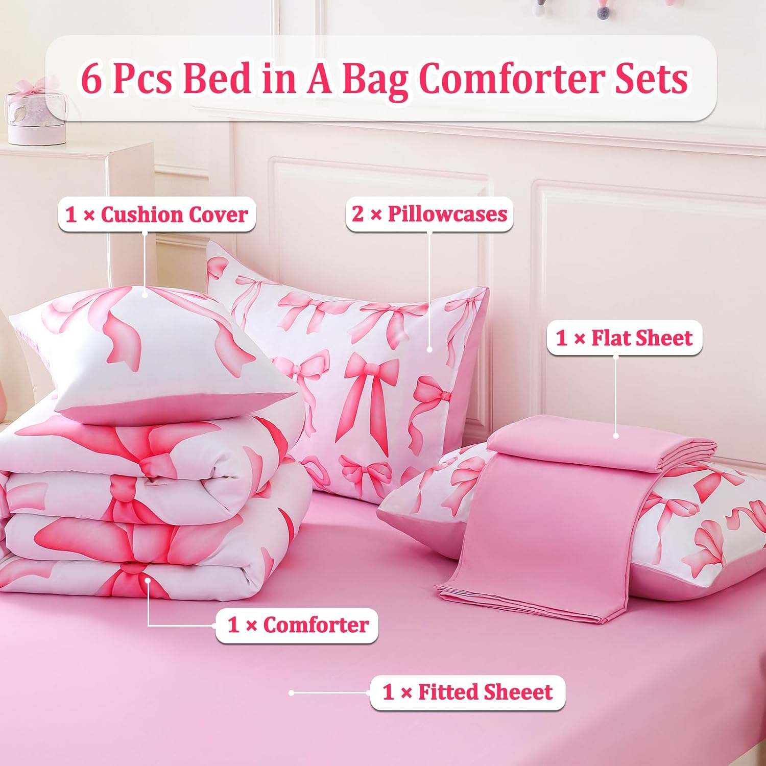 6 Pieces Full Comforter Sets with Sheets Pink Bed in a Bag for Girls,Bow Comforter Set,Bow Full Bedding Sets for Kids