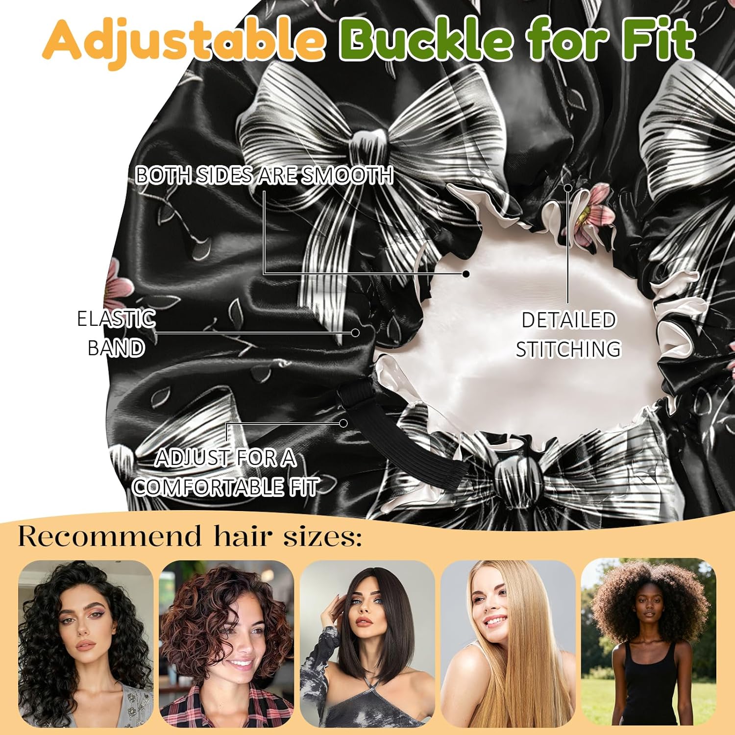 - 【Double Layer Satin Bonnet】With a double satin design, this nightcap is skin-friendly and comfortable, smooth and durable, and can protect your hair well while sleeping, locks in moisture and reduces friction, giving hair a natural shine and preventing tangles, breakage, dryness, frizz. Moderate length of the strap, good fit to the head, use without marks.