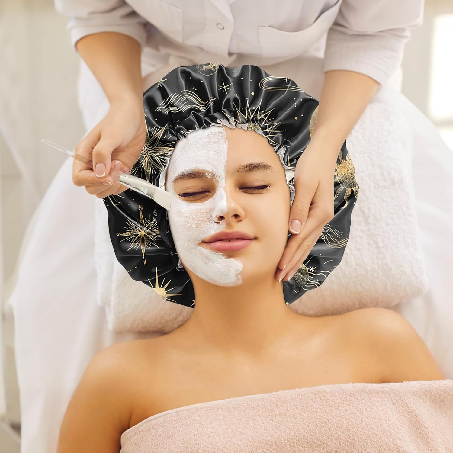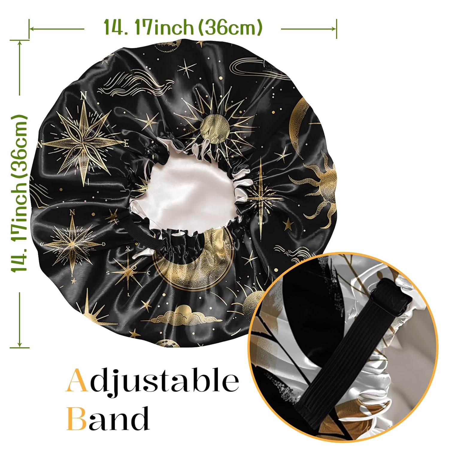 2 PCS Bonnets for Women Girls Satin Hair Bonnet Silk Adjustable Elastic Double Layer Hair Wrap Sleep Cap Comfort Cute-Sun Moon Leaf