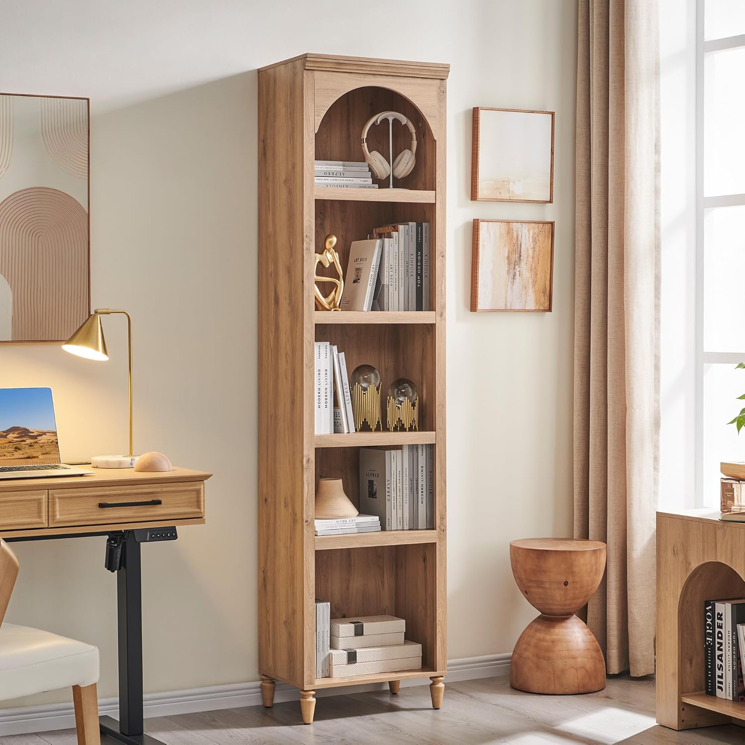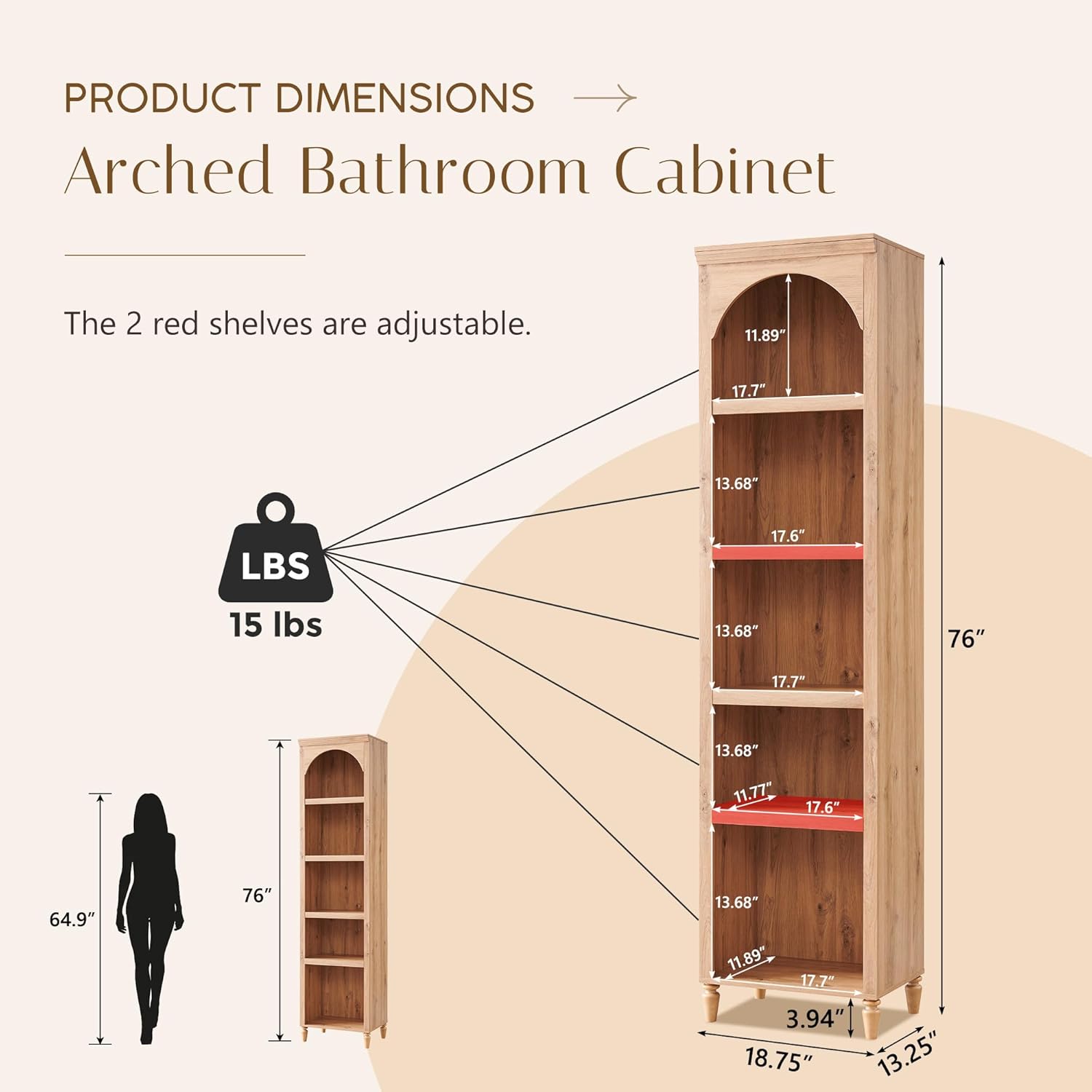 76" Tall Arched Bathroom Storage Cabinet, 5 Tiers Narrow Farmhouse Arched Cabinet w/Adjustable Shelves, Modern Wooden Storage Cabinet for Bathroom, Living Room, Entryway, Study Room (Natural)